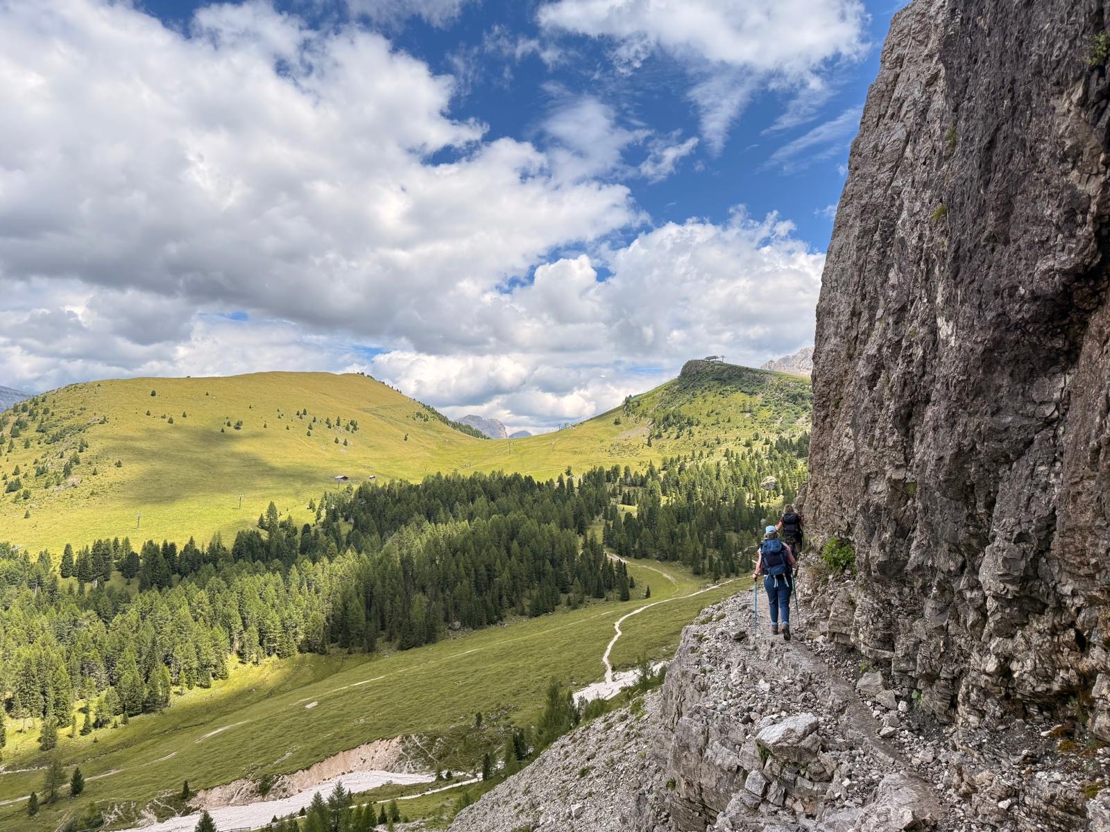 Na de lunch, waar ik mijn gehavende onderarm heb kunnen inspecteren en desinfecteren, vervolgen we onze weg langs een breed pad waar het stikt van de mensen. We zitten in Val Gardena, een populair gebied waar mensen met de auto heen kunnen. Groene grasweiden en hoge rotsachtige bergen wisselen elkaar in een dramatisch landschap af.