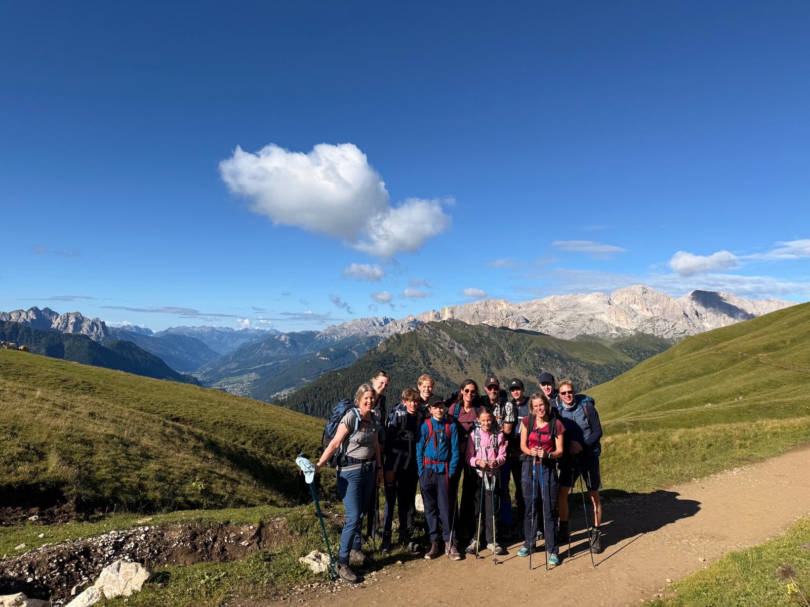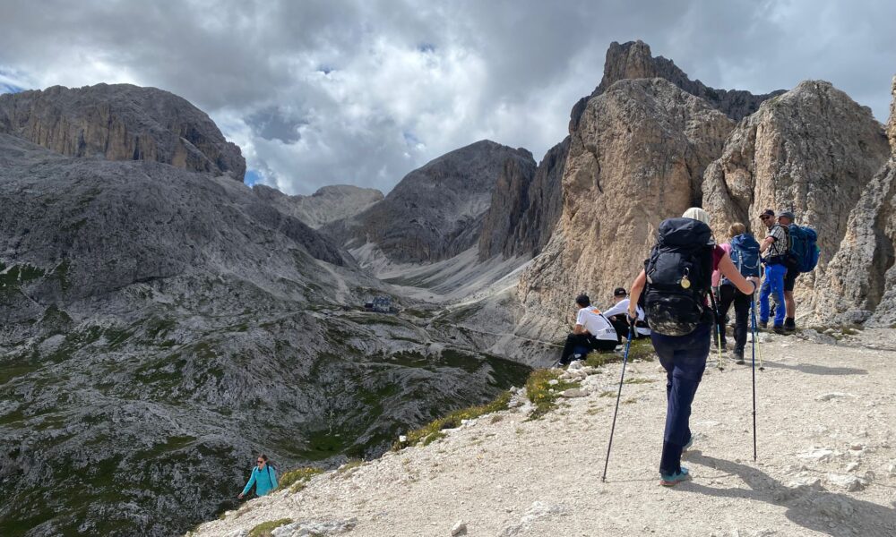 Waarom dóen we dit? Vanochtend zitten we allemaal met dikke ogen stilzwijgend aan het ontbijt. Er staat een klim op de planning waar we allemaal als een berg tegenop zien. In het begin nog niet; we krijgen tijd om rustig wakker te worden op de ‘Friedrich August Weg’, om daarna onze weg te vervolgen langs het Sassolungo Massief. De dag eindigt echter met een klim vanaf de Val Duron op 1850 meter, naar onze accommodatie, drie kilometer verderop gelegen op 2497 meter hoogte. In de klim zitten stijgingspercentages van 36%! Een deel van onze bagage thuis laten zoals gister, zit er ook niet meer in. We slapen elders, dus alles moet mee. We laten ons het ontbijt goed smaken; als we ooit de energie goed konden gebruiken, was het vandaag wel!